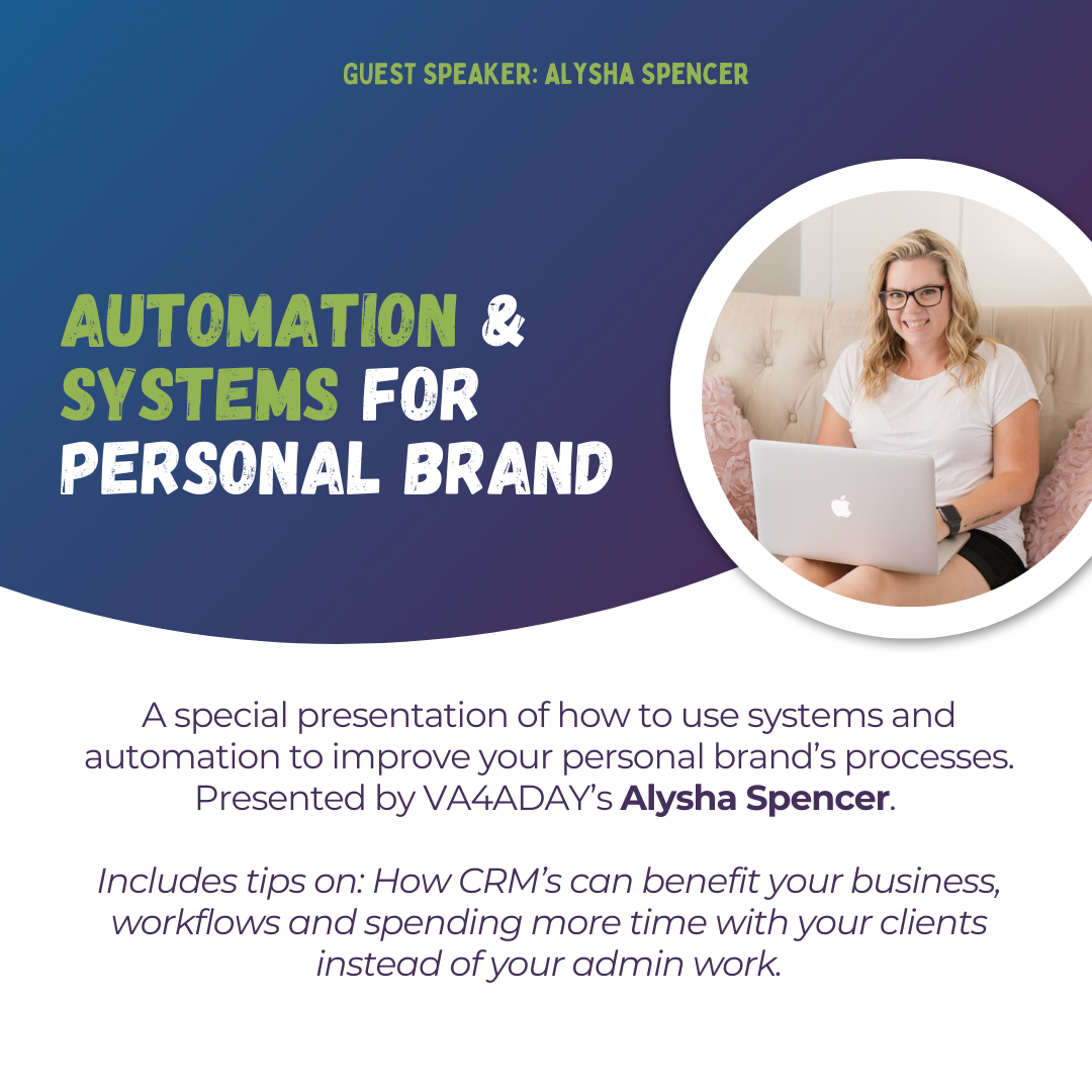 Learn some tips and tricks for using automation and systems in your personal brand. We are joined with special guest Alysha Spencer from YourVA4aDay who absolutely loves using Content Relationship Management Systems like 17hats to improve your workflows. She'll give us some insight and actionable items to streamline your business.