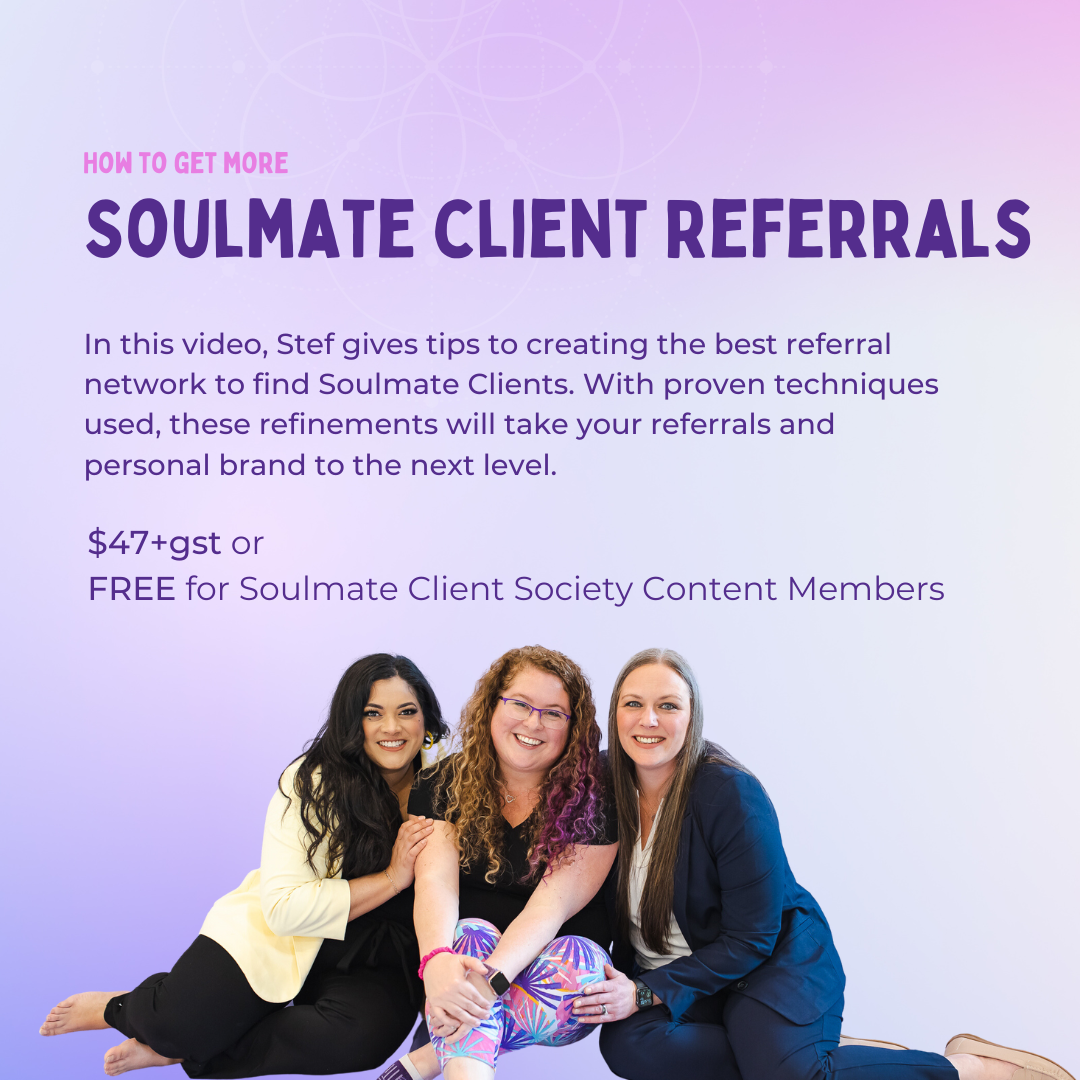 In this video, Stef gives tips to creating the best referral network to find Soulmate Clients. With proven techniques used, these refinements will take your referrals and personal brand to the next level. After taking courses on referrals and running a business formed strongly on a referral network, Stef will help you take things to the next level and attract Soulmate Client Referrals!