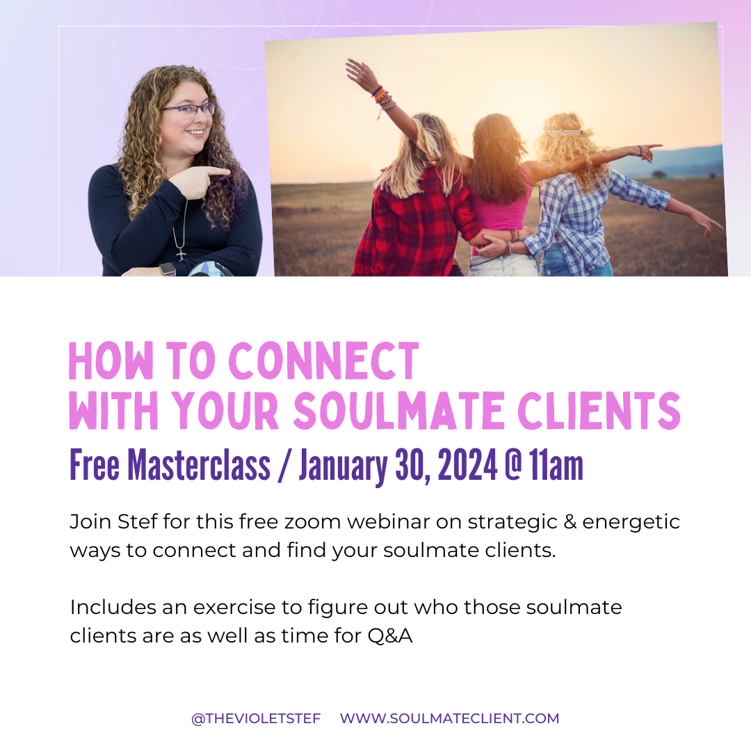 Have you always wanted to have ideal clients but people just aren't fitting the mould? Soulmate clients are the ones that are meant to be, while ideal clients just seem like a wish - and they never really seem to come true. Join me for this free webinar on strategic & energetic ways to connect and find your soulmate clients. Includes an exercise to figure out who those soulmate clients are as well as time for Q&A