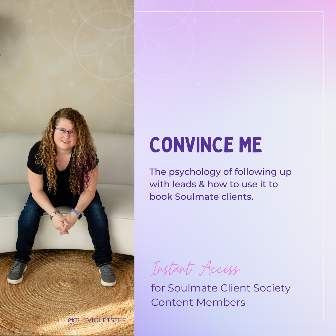 This informational video I talk a little bit about how people tend to process information in related to following up. Then how you can adjust it to fit your business and work better with your soulmate clients. Only available to Soulmate Client Society Members (Content & Circle)